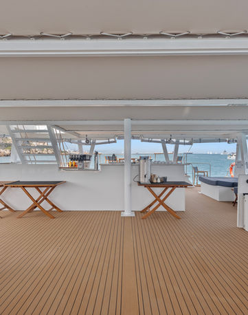 Mayba, maxi-catamaran premium de 20 m de long sous Pavillon Français, est conçu pour offrir une expérience maritime unique. Avec une capacité exceptionnelle de 200 passagers et un design lounge sur deux niveaux, ce modèle Day One 65 repousse les limites du confort en mer.