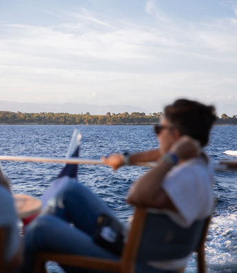 La navigation retour s’effectue dans une atmosphère douce et chaleureuse, sous un ciel aux teintes dorées, pour conclure cette escapade en mer sur une note élégante et légèrement festive.